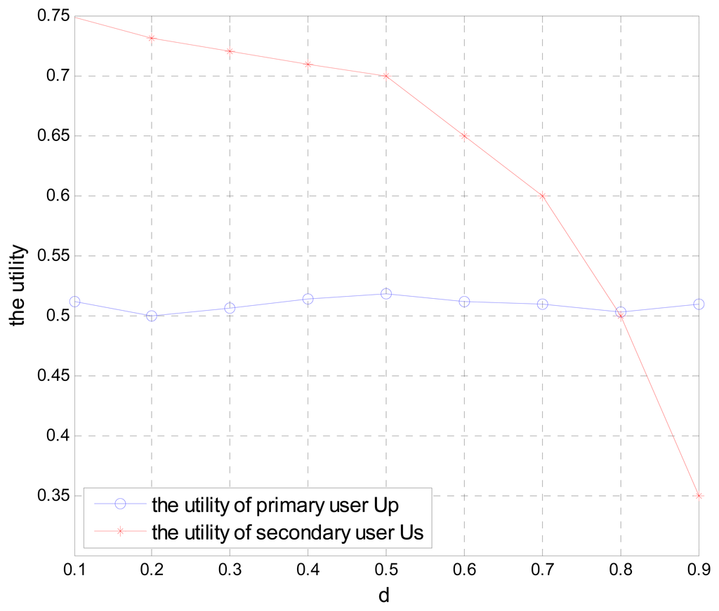 As shown in Figure 7, when the cooperative scheme is used, the utility function of secondary user decreases as the normalized distance of all secondary users' locations to PT d increases. In this case, the leased spectrum and the access opportunities of secondary users are both increased. Since the utility of the primary user consists of two parts, i.e., the achieved transmission rate and the payment from secondary users, as shown in Equation (11), the cooperative users adaptively adjust their own payment in the Stackelberg game and cause the utility function of the primary user to have tiny fluctuations. Thus in the Stackelberg game, the primary user's long distance communication is guaranteed by activating the secondary users' cooperation.