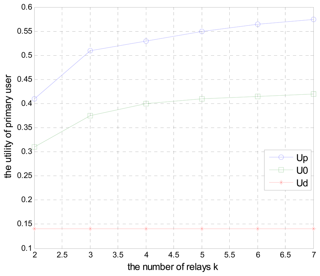 Figure 8 reflects the relationship between the utility function and the number of secondary relays under three different schemes as analyzed above. When the distance between the primary user and secondary users is d = 0.3, as shown in the figure, Ud remains constant when the primary user has not cooperated with secondary users by leasing spectrum and transmits their data directly to the primary receiver. When all of the primary user's bandwidth is given to secondary users, the utility U0 goes up as the number of the secondary relays increases. Similarly, the utility UP under the cooperative scheme also increases when the number of secondary users increases, and is better than other two utilities. In addition, U0 and UP remain stable when the number of secondary relays reaches to a certain threshold due to the limited resources become saturation.