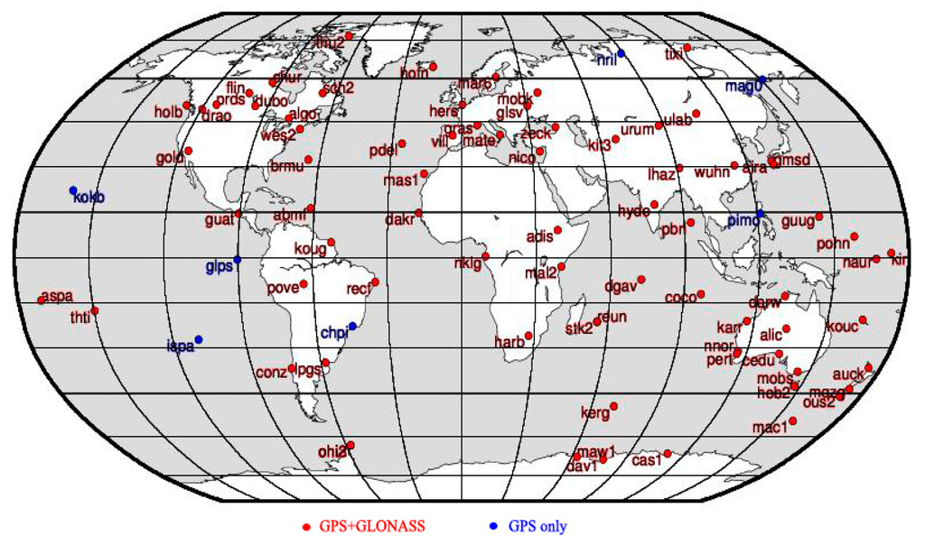 Up to now, about one hundred stations are available to track both GPS and GLONASS satellites simultaneously. The precision of ERP is related more to the distribution of the satellites than the number of stations [32] and does not improve much when the number of sites increases over 60 according to Wei et al. [33]. Here, about 80 sites from International GNSS Service (IGS) [34] are selected to estimate ERP.