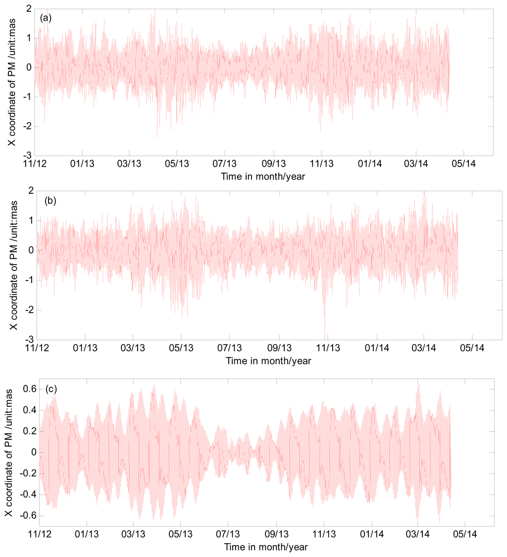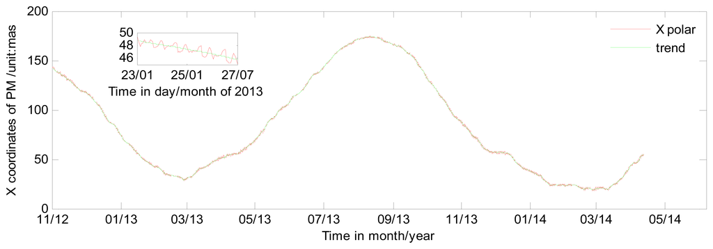 Figure 3 shows the detail effects of the de-trending method. Upper left is the enlarged sub-figure of the ERP series from 23–27 January 2013. From Figure 3, we can see the de-trending method of smoothness priors approach performs very well in fitting the trends of ERP series, and the trends we acquire are very similar to IERS C04. Then the high frequency variations of ERP are generated by subtracting the trend from the original ERP series we estimate.