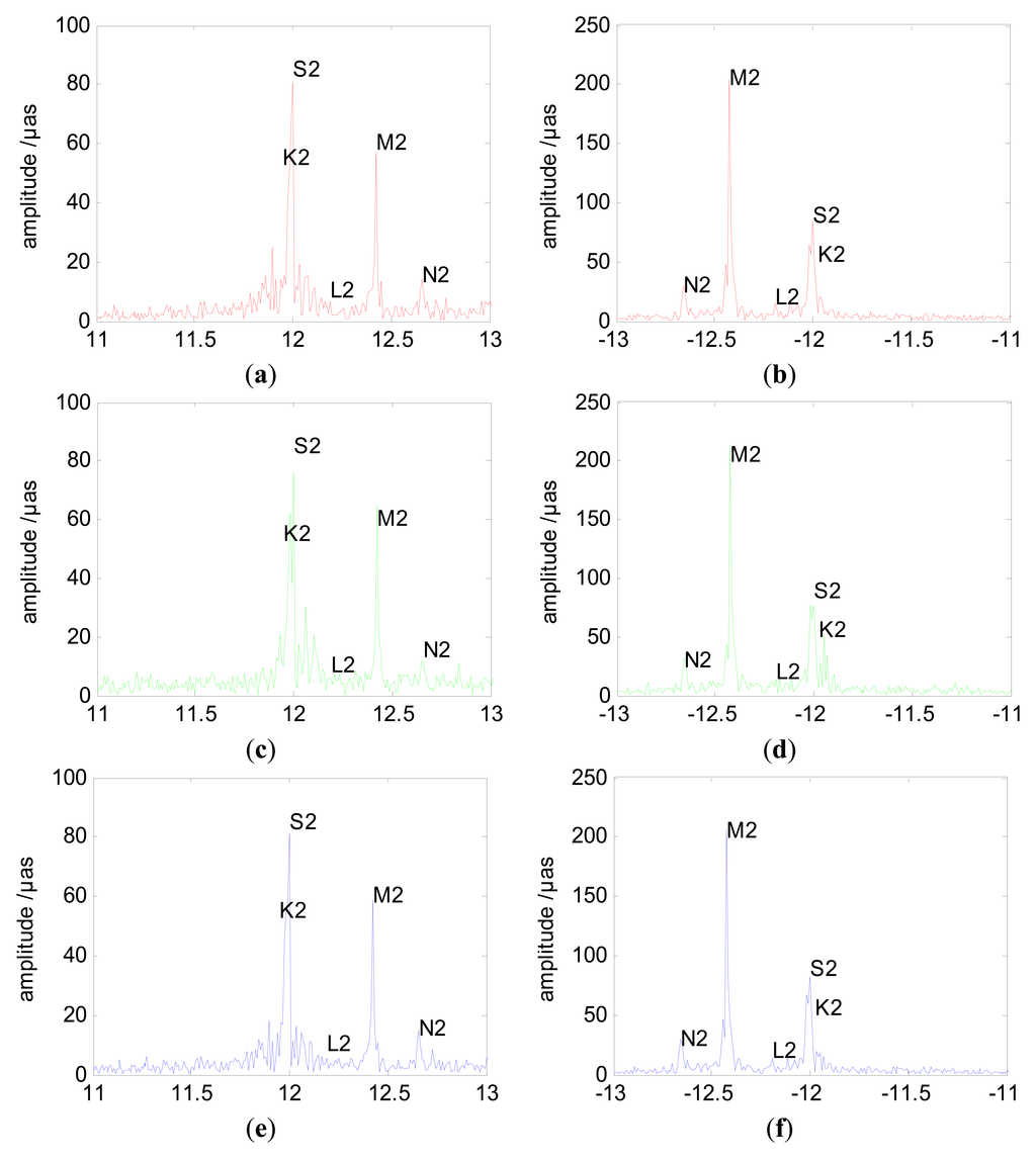 - Ray, R.D.; Steinberg, D.J.; Chao, B.F.; Cartwright, D.E. Diurnal and semidiurnal variations in the Earth's rotation rate induced by oceanic tides. Science 1994, 264, 830–832. [Google Scholar]