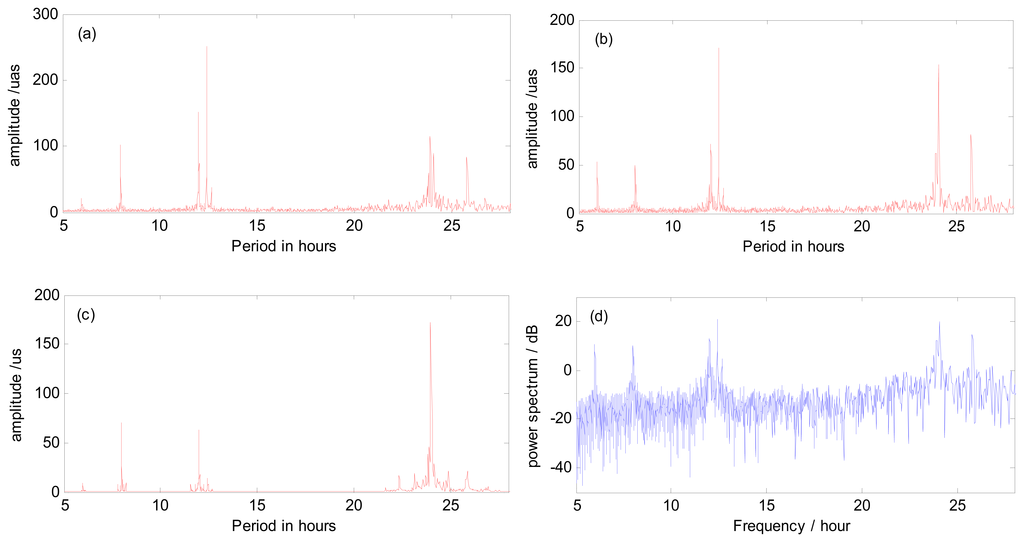 In this manuscript, we also estimated the ERP with 4 h sub-interval, namely ERP at a temporal resolution of 2 h. Figure 6a–c shows the amplitude spectrum analysis results of high frequency variations generated by combined GPS and GLONASS from 4 h sub-intervals with 3-day arc orbit. The amplitude spectrum analysis results almost show the same period terms in the X-pole and Y-pole. The amplitude spectral results of UT1-UTC show slightly different period terms than PM. Again, the amplitudes of these terms from UT1-UTC are extremely large when compared to IERS conventions. As we mentioned before, the reason is that the accuracy of UT1-UTC we estimated is not as good as PM due to the strategy we used. Other spurious signals may also be responsible for this. However, most of these periods are located around about 8 h, 12 h (semidiurnal variations) and 24 h (diurnal variations). Besides, we also get the detailed information about the amplitude of the noise as well as every period term. In addition, power spectrum analysis is also introduced to acquire a basic understanding of the energy distribution through all the period terms. As an example, the X-polar power spectrum analysis result is shown in Figure 6d. As the sub-figure shows, the power spectral peaks show almost the same result as the amplitude spectrum in that the main period terms are clustered together at one third day, semidiurnal and diurnal bands. As we may see, the power spectrum also shows a visible noise fluctuation. The most reasonable explanation is that when analyzing the power spectrum the whole series is regarded as a complete signal. If we divide the whole series into several pieces, the fluctuation can be smoothed.