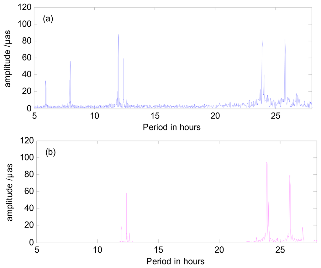 Furthermore, in order to analyze the impact of the length of sub-interval on the tidal amplitudes generated from the high frequency variations, the amplitudes of high frequency variations are estimated from both 2 h sub-interval and 4 h sub-interval. The amplitudes of prograde, retrograde PM and UT1-UTC generated from 2 h and 4 h sub-interval are compared. As we all know, the period terms (including diurnal and semidiurnal variations) generated from the high frequency variations are mainly the consequence of redistribution of geophysical fluid mass, especially the ocean tide. The tidal potential generated by moon and sun changes the ocean currents that cause the redistribution of earth fluid mass, which in return caused the variation in earth rotation. For instance, the period of 1.0024 days we obtain from the high frequency variations in ERP is one of the components of the ocean tides (which may correspond to P1 in IERS tide model). As a comparison, the prograde PM from IERS convention 2010 is shown in Figure 7 as well as our result. As Figure 7 shows, we obtain dozens of diurnal terms and semidiurnal terms. In addition, we also acquire several small terms, which are distributed around 1/3 d and 1/4 d. These short period terms are not included in the ocean tide model. Some of these short terms may be caused by the data processing method we use, but the most possible explanation is artifact. This has already been proved by analyzing the formal error spectra [23].