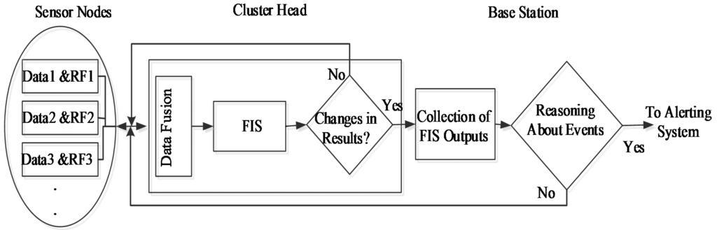 Then, the vector VFD will be fed and processed by the FLC with different inputs in the CHs. The output of the system is the consequent (fuzzy response) of events occurring in the monitored areas. FLC analyses the VFD vector based on a provided fuzzy rules after data fusion process was accomplished. If the consequent of the events in the clustered nodes was not changed, the CHs do not forward the data packet to the BS. Otherwise, the CHs send the output of the system to the BS. However, the change in the system output does not guarantee a correct detection and it is only considered as a possible event in the monitored area. Therefore, to make sure that the detection is accurate enough, the BS needs to regularly monitor and process the received outputs that are generated over the time. In fact, all the received probabilities are constantly processed by the BS. If a constant change is noticed, the event will be reported to the alerting subsystem by BS. Otherwise, the algorithm continues collecting data.