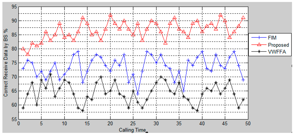 Figure 4 presents a percentage of correct data collected by BS by the proposed approach as well as FIM and VWFFA. As can be seen from the figure, the proposed approach provides a higher percentage of correct data compared with the other approaches.
