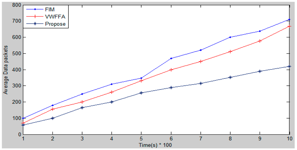 Figure 5 shows the average number of the data packets that are transferred. The proposed approach has a lower average number of the data packets that are transferred than that the FIM and VWFFA. The proposed approach has better performance than the other approaches because the entire collected data do not need to be transferred as only the true valued data are transferred. Moreover, CHs are not required to transfer the fused data as they are able to find the consequent result of the occurring events. The CHs send the calculated consequent only if it shows an abnormality based on the history of the data, so the data that is sent to the BS is going to be only the possibility of the detected fire. In contrast to the proposed approach, FIM has the highest number of data packets that need to be transferred in the network. The reason behind that is the entire incorrect and correct collected data and also redundant data need to be transferred. VWFFA has a lower transferred data number in the network than FIM. The reason behind that is the developed network is cluster-based and the data are fused based on the assigned weights on clusters. In VWFFA, the assigned weights reduces the influence of the incorrect data on the true values in the fusion process.