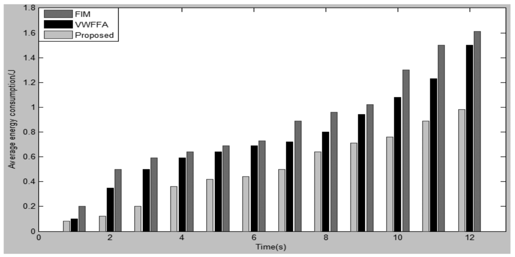 Energy consumption is also a critical feature of a WSN. The study by Hill et al. [32] proves that each bit transmitted in a WSN consumes about as much energy as executing 800–1000 instructions. That means any reduction of the data transmitted in the WSN can significantly decrease the energy consumption. Figure 6 illustrates the energy consumption in the networks. From the figure, it can be seen that the proposed scheme minimizes the energy consumption in WSN. That is due to the lower transfer data packets in the network (Figure 5). Moreover, data packets similar to VWFFA are sent to their CHs consequently, lower energy is required as compared to FIM.