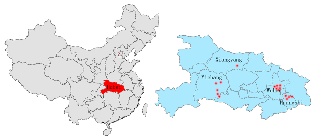 Hubei Province (Figure 1), with an area of 185,900 km2, is geographically situated between 29°05′–32°20′ N and 108°21′–116°07′ E in central China. The boundaries of the first and the second ladders of China cut through Hubei from north to south, which makes the topography vary significantly from east to west in Hubei. The provincial capital, Wuhan, is the political, economic, financial, cultural, educational and transportation hub of central China. The famous Three Gorges Dam and the Gezhou Dam, which are the origin of the West-East power transmission project, are both located in Yichang, in western Hubei. Hence, the robustness of the power grid is critical not only to the central China region but also to eastern China.