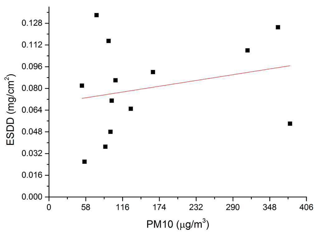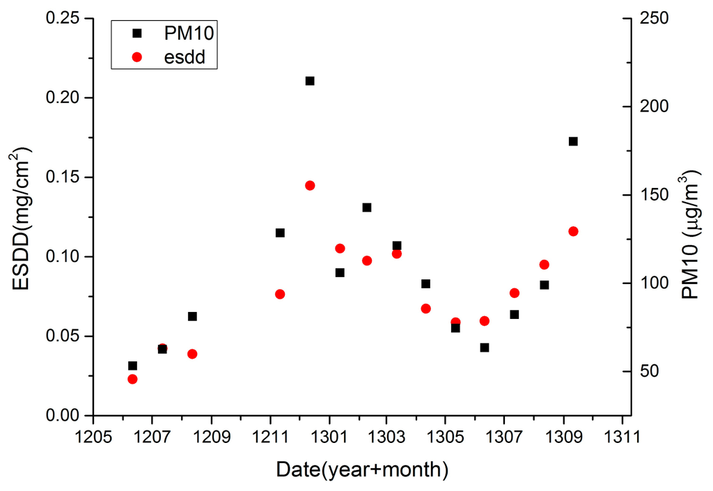 Figure 10 shows the processed ESDD and PM10 data. A very evident positive relationship between monthly-averaged ESDD and PM10 is shown in Figure 10. A linear regression equation with R2 of 0.78 can be built. Therefore, it is concluded that the relationship between ESDD and PM10 is proved at a regional scale and a monthly scale. Lasting monitoring of air pollution at each ESDD on-line measurement site would be very helpful to reveal numeric relationships between ESDD and PM10 at a local scale and a daily scale.