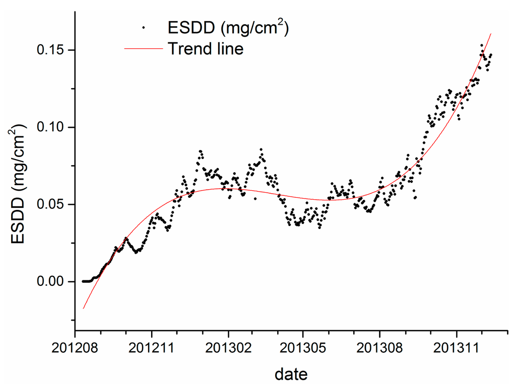 Furthermore, Figures 3 and 5 illustrate that there are many burrs in the curve of daily ESDD measurement. However, we have inadequate confidence to distinguish which parts are meaningful signals and which parts are merely noises. In our opinion, the absolute accuracy is the major drawback of on-line measurements. Only time series of measurements is meaningful and robust for scientific research, so would be risky to draw any conclusion from an individual measurement. The data of Wuhan thus has to be abandoned because of lack of integrality regarding the monitoring span. Figure 11 shows the average daily ESDD of Yichang and the corresponding trend line calculated by a three order polynomial function.