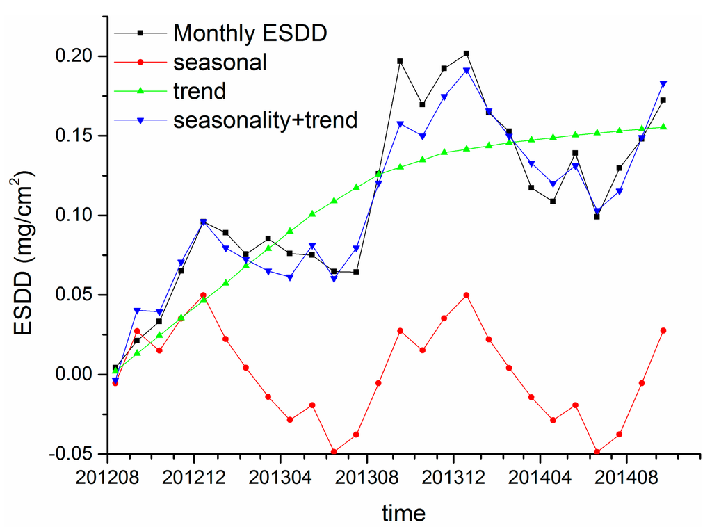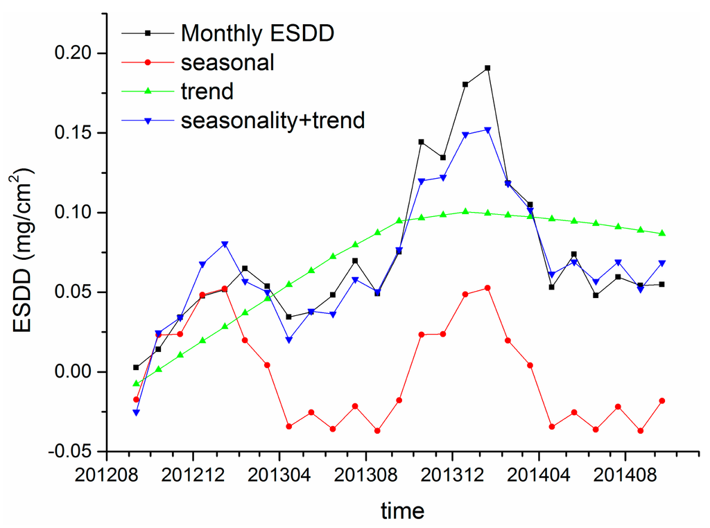 Figures 12 and 13 demonstrate the resultant components of Huangshi and Xiangyang sites, respectively. The blue lines and black lines are very similar, indicating that the reminder is acceptable. Therefore, the results of time series analysis are accurate and reliable. Regarding the ESDD trend, an evident relationship between the ESDD and accumulation time is revealed at a large time scale, which can be expressed as ESDD = a − b × exp(−t). Many tests in artificial environments show such relationships at a time scale of hours or days. To our knowledge, the ESDD trend at the time scale of years has not been reported yet by using numeric analysis.