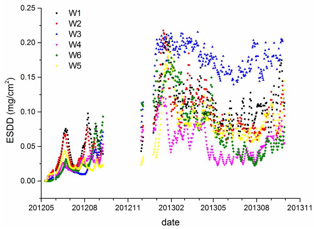 Figure 3 shows the daily ESDD acquired by the on-line measurement apparatus from six sites in Wuhan. The monitoring project started in 2011. There are very sparse measurements before April 2012. Hence, the data shown in Figure 3 start from that time. Besides, there are two gaps in the observation sequences because of apparatus maintenance. The averages of W1 to W6 are 0.09, 0.08, 0.13, 0.05, 0.07 and 0.07 mg/cm2, respectively, with standard deviations of 0.046, 0.045, 0.028, 0.048, 0.042 mg/cm2, respectively.