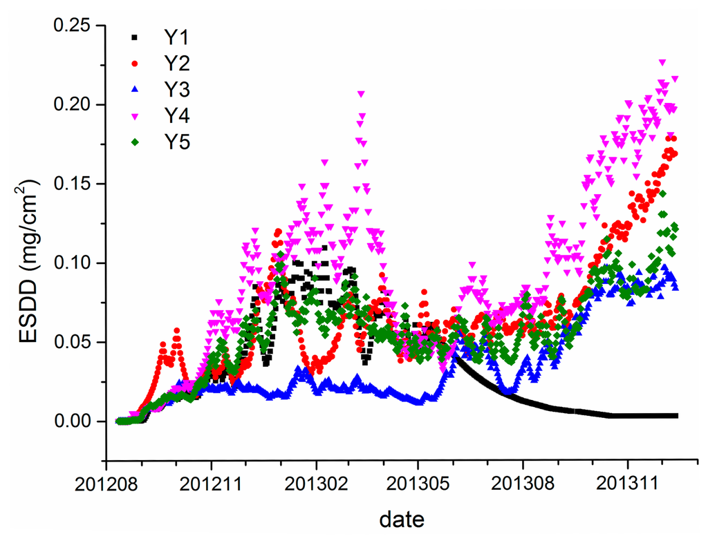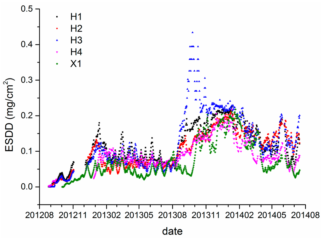 Finally, it is worth noting that the duration periods of both the Huangshi and Xiangyang sites are not long enough to draw any quantitative conclusions. Long-term observations of daily ESDD will be definitely critical for a further and more detailed study. Besides, observations from more regions are necessary to verify the discovered rules and to further study characteristics of deposits adhering on insulators.