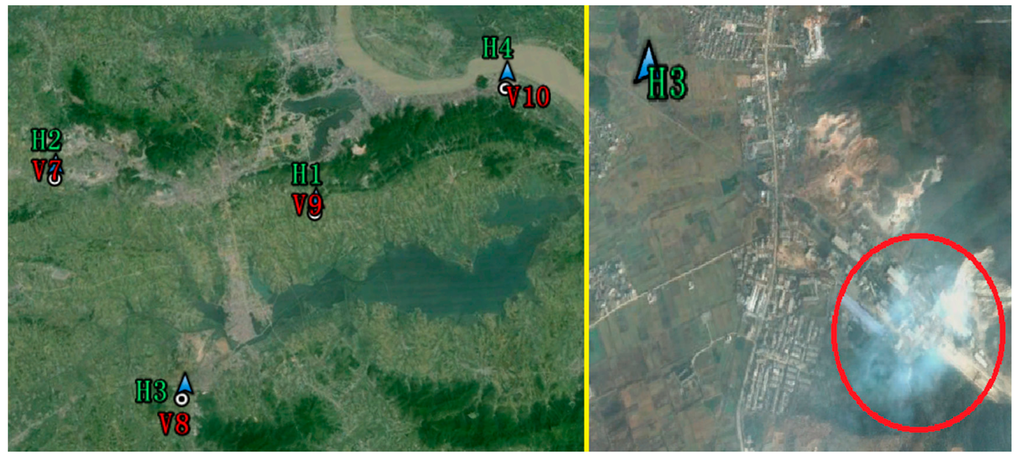 Figure 7 shows the on-line ESDD measurements from Huangshi and Xiangyang. It would be lengthy to further analyze the relationship between the ESDD and pollution levels. However, a singular phenomenon is immediately noticed in the on-line measurements of H3. There is an abnormal fluctuation in the curve of H3 between late September and early November in 2013. According to satellite imagery, H3 is the only site among all 16 sites which is located in a large area of farmland. To our knowledge, peasants in Hubei have habit of burning stalks in autumn to increase the fertilization of the fields though previous research has shown no significant effects. It is speculated that the abnormal fluctuation probably are attributable to the biomass burning near the H3 site. Figure 8 shows the land cover near H3. Coincidentally, a plume of smoke was captured by the passing by satellite. There is no direct evidence to blame biomass burning for the dramatic rise of ESDD because the acquired date of the imagery shown in Figure 8 is not consistent with the date of the incident. However, Figure 7 proves that there are indeed some biomass burning incidents near H3. Consequently, we strongly suspect that the singular phenomenon in Figure 8 is related to the biomass burning. Fontana has proved that the biomass burning during harvest periods indeed exerts an evident influence on insulator contamination using another ESDD on-line measurement technique in Brazil []. Hence, it is recommended that maintainers of power transmission lines should pay great attention to insulators that are located in farmlands in autumn.