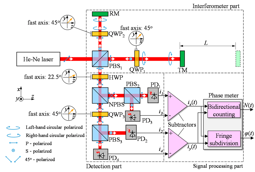 As shown in Figure 1, a homodyne interferometer can be divided into three parts: an interferometer part, a detection part and a signal processing part. In the interferometer part, a 45° linear polarized laser beam was applied to a polarizing beam splitter (PBS) and divided into two beams, one vertically polarized and the other horizontally polarized, which are propagated along the separated arms of the interferometer. In each of the arms, the beam passed through a quarter-wave plate (QWP) twice, and its polarization state was rotated through 90°, so that the beam initially reflected by PBS was then transmitted and propagated to the detection part, and the beam initially transmitted by the PBS was then reflected and propagates to the detection part. In the detection part with a half wave-plate (HWP), a QWP, a non-polarizing beam splitter (NPBS) and two PBSs, interference signals, i1, i2, i3 and i4, were detected by the four photo detectors, and they had the phases of 0°, 90°, 180° and 270°, respectively. In the signal processing part, the two quadrature signals were obtained by subtracting i1 from i3 and i2 from i4, and then they were converted into a displacement through bidirectional counting and fringe subdivision.