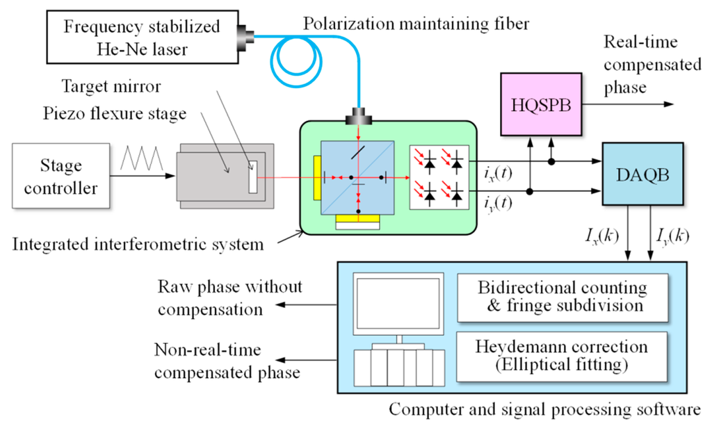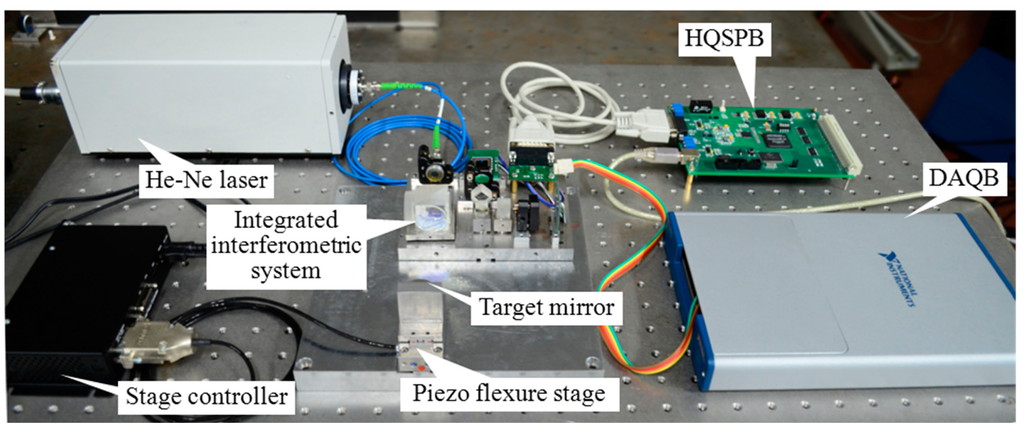 As shown in Figures 11 and 12, a He-Ne laser whose frequency was stabilized at 633 nm was utilized as the laser source and was coupled to a commercial integrated interferometer system (S2800, Harbin HUE Ltd., Harbin, China) through a polarization maintaining fiber. The target mirror of the interferometer was attached to a one-axis piezo flexure stage (P-753.2CD, Physik Instrument, Karlsruhe, Germany), which was controlled by a high-speed stage position controller (PI E-709.CP, Physik Instrument). A pair of quadrature signals from the integrated interferometer system was transmitted into the HQSPB and a 16-bit resolution data acquisition board (USB 6356, National Instruments, Austin, TX, USA) at the same time. The HQSPB could be used to obtain the real-time compensated phase information from the quadrature signals, while the data acquisition board and a computer were used to obtain both the raw phase information without cyclic error compensation and the non-real-time compensated phase information using the conventional elliptical fitting method [5].