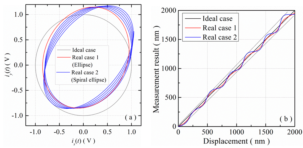 However, as observed from Equation (4) below, in reality, the quadrature signals have not only an amplitude difference and a DC offset but also a phase delay [10] because of the misalignment of optical elements, the imperfections in optical elements and electronic circuits, or the improper movement of the target mirror [5–10]. As a result, the Lissajous trajectory of the two quadrature signals was distorted from an ideal circle, and cyclic error would occur when the ideal model in Equation (2) was utilized to calculate the phase of real quadrature signals: