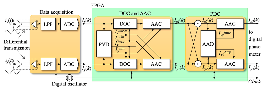 As shown in Figure 3, the proposed method is composed of three systems: a data acquisition system, a DC offset and AC amplitude difference correction system and a phase delay correction system. These three systems were synchronized by the same high-speed clock and worked in parallel with each other.