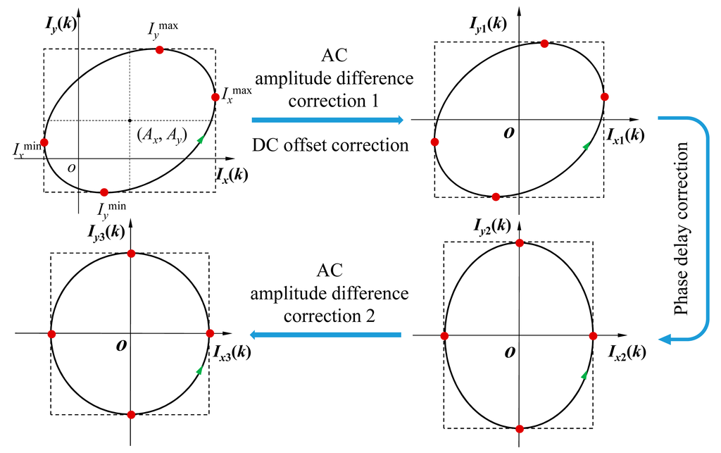 In the DC offset and AC amplitude difference correction system, the fast peak detection module could be used to dynamically check the peak values of Ix(k) and Iy(k). Upon completion of this correction, there was still a phase delay between the corrected quadrature signals, Ix1(k) and Iy1(k), respectively.