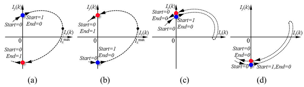 As shown in Figure 6c, at the end of the traversal from the 2nd to the 1st quadrant section, the trajectory did not continue its travel to the 4th and 3rd quadrant sections, as mentioned above, but returned from the 1st to the 2nd quadrant section once again, which made it difficult to determine whether the real Ixmax was obtained. To avoid such a vague Ixmax, End would remain to be 0 if the trajectory missed the progress of going across the 1st quadrant section and the 4th quadrant section to the 3rd quadrant section, so that the detector would not update an improper Ixmax. The same procedure was valid for the trajectory shown in Figure 6d. The control logic for detectors Ixmin, Iymax, and Iymin is similar to that mentioned above regarding detector Ixmax.