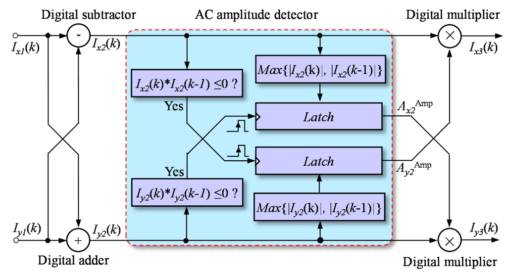An AC amplitude detector and two digital multipliers were used to balance the amplitudes of Ix2(k) and Iy2(k). Because there was no DC offset or phase delay in Ix2(k) and Iy2(k), their AC amplitudes could be detected in a simple way. According to Equation (11), the AC amplitude of Ix2(k) could be achieved when Iy2(k) was approximately zero, and the AC amplitude of Iy2(k) could be achieved when Ix2(k) was approximately zero. The function of the AC amplitude detector could be expressed as: