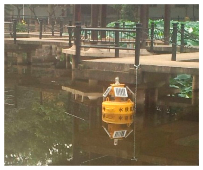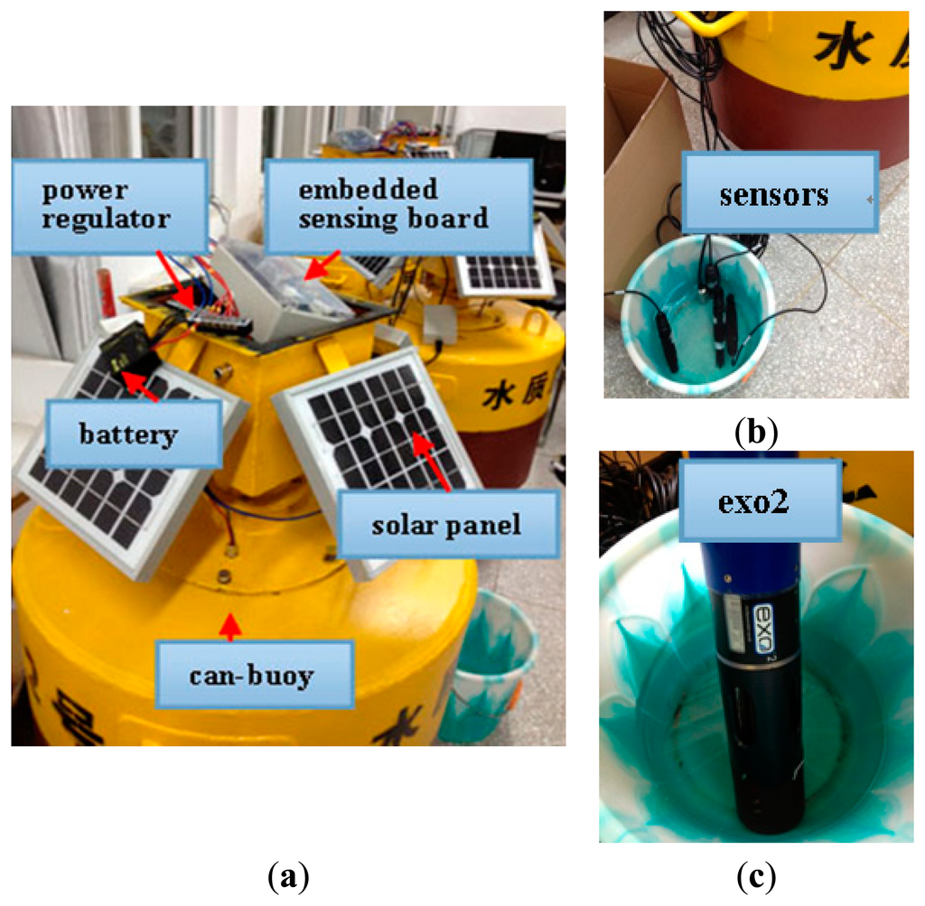 We develop a heterogeneous sensor platform for comprehensive aquatic environments monitoring. Figure 3a shows the components of the aquatic sensor node. The main body is a can-buoy, as the carrier of the sensing platform, which is deployed in monitoring waters. Embedded sensing board is the hardcore of the aquatic sensor node, and responsible for signal sensing, processing and communication. According to the desired application, the sensor node is also equipped with five types of aquatic sensors, namely, depth sensor, temperature sensor, conductivity sensor, dissolved oxygen sensor, and pH sensor, as shown in Figure 3b. All of them connect by sensor interfaces with the embedded sensing board. The measurements with low-end sensors usually deviate from actual values, as a result, we use EXO2, a multiparameter water quality sonde from YSI shown in Figure 3c, to crosscheck the calibration of these sensors.