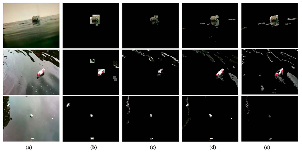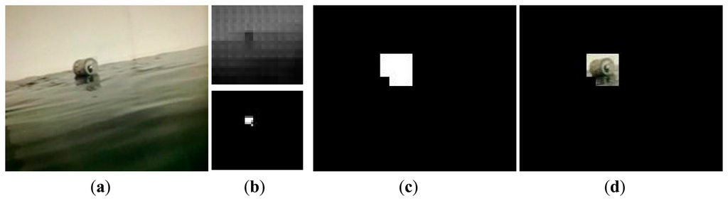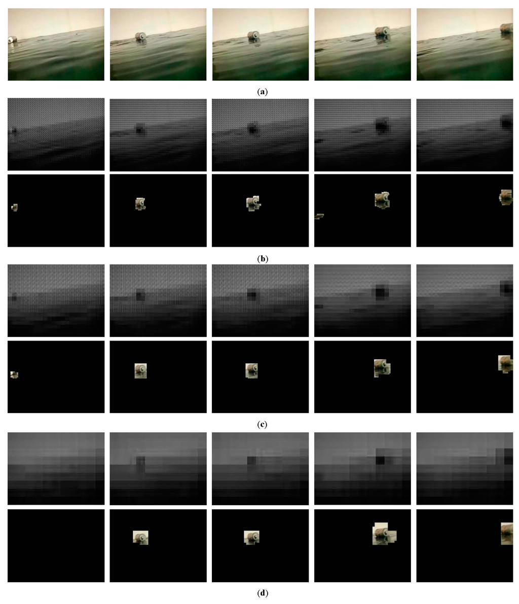 We now describe the effectiveness and intrinsic properties of the proposed method, and adequately address the impact of the block size on the debris detection. The tests are conducted on a video sequence of 150 frames captured from an imitative aquatic environment in the laboratory. The image size is 352 × 288 and the frame rate is 25 fps. The parameters in this experiment are as follows: M = 16, f = 15, Th = 25, τ = 3, and δ = 10. Figure 9a is the original frame where a tin can is floating on the water in the presence of persistent waves. Figure 9b–d show the results of debris detection under 8 × 8, 16 × 16 and 32 × 32 block size, respectively. Specifically, the first row is the reconstructed frame, and the second row is the detected debris object. Note that all reconstructed frames are shown in the same size as original images in order to distinguish differences between them. As can be seen, the larger the block size, the more image detailed information is lost. And because of this, our method effectively mitigates the impact of waves. In general, under three different block size, the proposed method can almost identify the debris object. However, it is worth focusing on some differences and details. From the result of frame 119 shown in Figure 9b, we can see that a small piece of background corresponding to a heavy wave is incorrectly detected as foreground. This means that a small block size is not able to handle the severe disturbance. Also, the result of frame 41 shown in Figure 9d shows that no debris objects is detected. Foreground objects with small size are likely to be omitted due to the loss of image information under a large block size. Furthermore, it is clear that the debris object location and area can be more accurately pinpointed by using a small block size. The detection results in Figure 9d contain more background surrounding the debris object than those in Figure 9b. Comparatively, when we take into account both detection accuracy and granularity, the 16 × 16 block size is a better choice for this aquatic environment, as shown in Figure 9c.