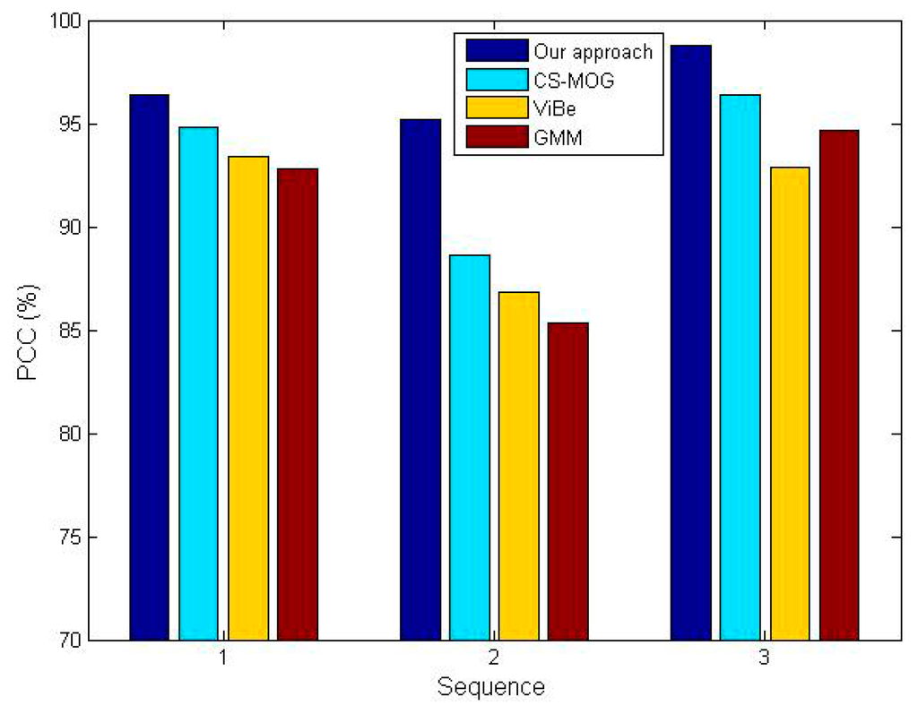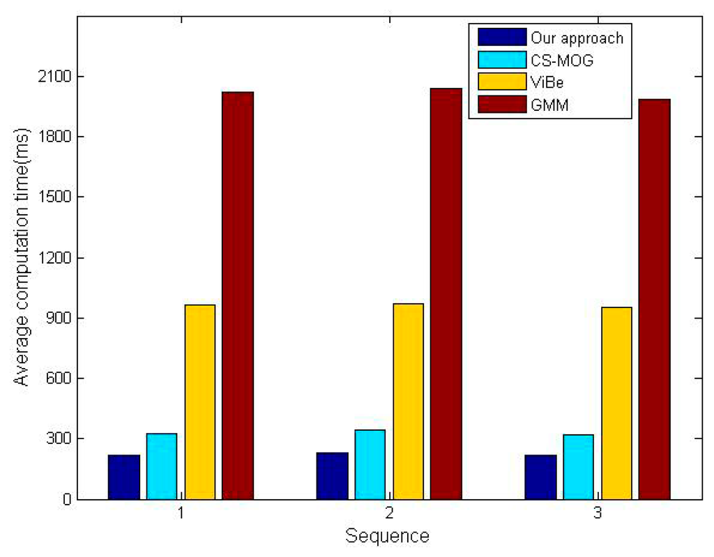 Two metrics, the percentage of correct classification (PCC) [32] and average computation time, are adopted for the comparative tests. Note that the former needs to be as high as possible in order to minimize detection errors, instead, the latter should be as small as possible to save energy and hardware resources. The PCC scores of the four algorithms for three sequences are shown in Figure 11, which confirm our method gives the best performance in detection reliability. The PCC increments of our method vary from 6.6% to 10.3% in comparison with CS-MOG, ViBe and GMM. Furthermore, Figure 12 shows the average computation time per frame. We can observe that the methods using dimensionality reduction, our method and CS-MOG, are evidently faster than the pixel-based methods. For example, for the first sequence, the average computation times of our approach, CS-MOG, ViBe and GMM are 219.61, 324.47, 962.1 and 2018.87 ms, respectively. Besides, our approach is 32.3% faster than CS-MOG. From the foregoing, our approach performs best in terms of detection reliability and computation efficiency.
