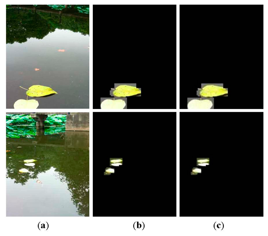 To achieve accurate debris detection over time, it is crucial to update the background model. As described in ViBe [23], older samples in the background model should not be compulsorily discarded or replaced by the new ones, it is more appropriate to ensure a monotonic decay for the remaining lifespan of these samples. Besides, in many practical situations, it is not necessary to update each background pixel model for each new frame. When a pixel is classified as the background, a random probability determines whether this pixel is used to update the corresponding pixel model. Similar to this idea, our update scheme is described as follows. Assume that the background model at time t is Mt = {Mt(i, j)}, and the probability of a sample in the model being preserved after the update of the pixel model is given by (f − 1)/f. For a reconstructed frame, as shown in Figure 7b, its foreground mask can be determined by matching Mt. If a pixel (i, j) is marked as background, its value is likely to be incorporated into the background model at time t + 1, Mt+ 1(i, j). This means any sample in Mt(i, j) will be chosen with probability of 1/f and replaced by the current pixel with a probability of 1/δ. In the aquatic monitoring, the value of δ between 5 and 10 is suitable. A smaller threshold should be applied if the environmental change is more severe. This strategy greatly speeds up the background model update without reducing detection accuracy.