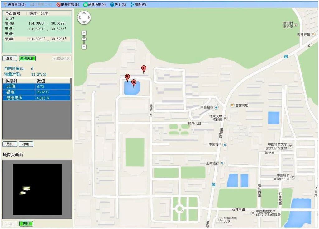 Figure 14 illustrates the user terminal screen of the host software. Firstly, the software contains the functionality to call Google map in order to fix positions on the sensor nodes through GPS. We can see from the right section of the screen that the sites of the three nodes are clearly marked on the map. Secondly, the host software allows the user to choose sensor nodes, as well as displays the water-quality data on the computer screen. These data are collected once every 30 s and shown in a data window located in the middle of the left screen. The identity number of the selected node is above this window. As shown in Figure 14, the pH, temperature and battery voltage values measured by nodes 6, taken at 11:27 a.m., are 6.73, 23.8 °C and 4.018 V, respectively. Thirdly, the two buttons in the lower left corner allow the user to start and stop the camera sensor. When the camera sensor is activated, the debris detection will be executed. Once debris objects are detected, the measurements are uploaded to the user terminal. It can be seen that the debris image of node 6 is recovered and shown in an image window on the bottom left of the screen. Alternatively, the camera sensor can be switched off when not performing the debris detection.