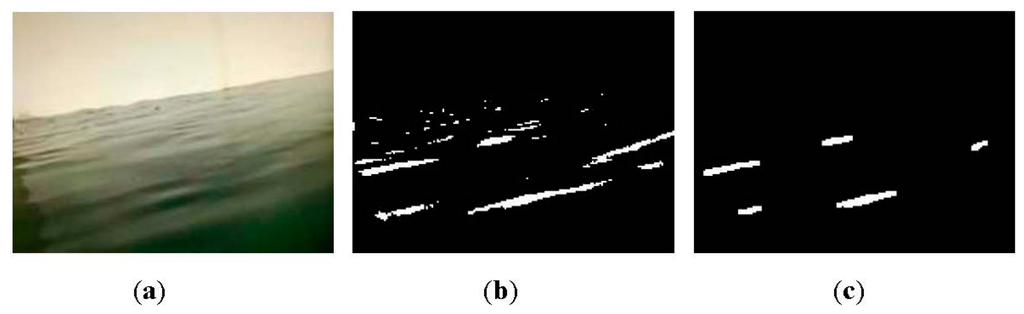 The key to aquatic debris detection is to extract the foreground objects from video sequences captured by camera sensors. A common way to foreground extraction is background subtraction. One such means, Gaussian mixture model (GMM) [16] has been widely adopted because of its ability to deal with subtle illumination changes. Several modified methods involving the number of Gaussians, learning rate and parameters update [17–20] also have been proposed. However, this kind of method is computationally intensive and subject to non-static scenes. A non-parametric method called kernel density estimation (KDE) has been proposed for background modeling [21], but this method has high memory consumption. In our earlier work [22], foreground pixels are identified by estimating the anomaly probability of each pixel, which outperforms GMM and KDE in coping with scenes including small motions and shadows. Recently, an efficient background subtraction technique called ViBe has been presented in [23]. It is reported that this method is superior to proven state-of-the-art methods in terms of both computation speed and detection rate. An example of debris detection using ViBe is shown in Figure 2.