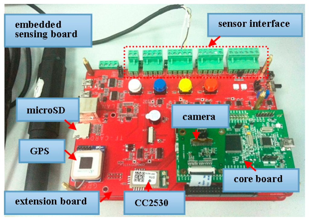 Figure 4 shows the embedded sensing board of a small size 9 cm × 12 cm, which consists of a core board and an additional extension board. The core board comprises a 32-bit 180 MHz Cortex-M4 processor which meets the low power requirements, a detachable camera sensor, and an external SDRAM of 64 Mbits. The processor embeds the digital camera interface that can connect with a camera to receive video data. The camera adopts OV9655, a low voltage CMOS image sensor that provides the full functionality of a camera and image processor on a single chip. The SDRAM is for storing image frames during debris detection, it can store 27 frames raw RGB images with a CIF resolution (3 bytes/pixel × 352 × 288 × 27 frames = 8 MB), which is more sufficient than the requirement for background subtraction. On the other hand, the bottom expansion board contains ZigBee module (CC2530) for networking and wireless communication, GPS for localization, and a 4 GB microSD card for local bulk data storage in case of intermittent network connection or network congestion. In addition, the expansion board has sensor interfaces which allow aquatic sensors to connect with the processor, and other peripherals. In short, the design uses a small number of functional blocks to minimize size, power consumption and manufacturing cost.