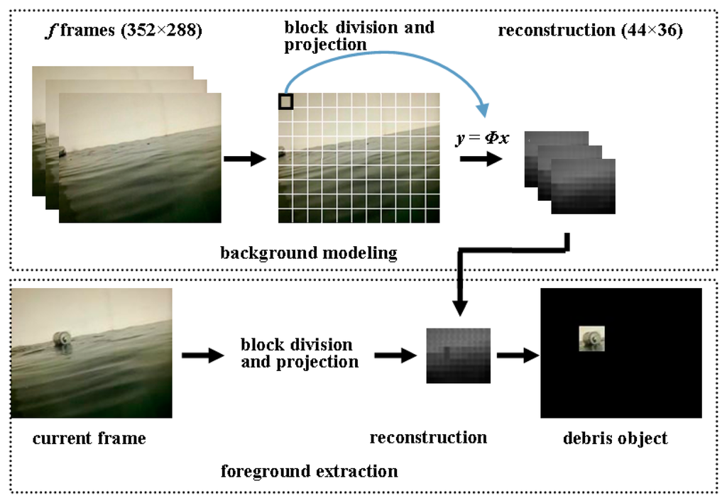 Figure 5 illustrates the outline of the proposed debris detection algorithm. In the phase of background modeling, the image is divided into sub-blocks whose size can be arranged to suit monitoring requirements. For each block, the linear measurements are computed by using Equation (1). Then a new image is reconstructed according to the measurements of all blocks, which contains useful information of the original image. For example, as shown in Figure 5, we break a 352 × 288 image into smaller blocks of 32 × 32 pixels. Each block can be expressed as a 1024 × 1 vector. After the projection with a 16 × 1024 measurement matrix, the high dimensional vector is transformed into a 16 × 1 vector. We can see that a 32 × 32 image block is replaced with another block of size 4 × 4, that is, the 352 × 288 original image can be characterized by the 44 × 36 reconstructed image. It is noteworthy that the background model is initialized from f reconstructed frames. In the phase of foreground extraction, current frame is processed in the same way as block division and projection. Each pixel in the reconstructed frame is compared to background samples to determine if it is classified as foreground. We detail the debris detection algorithm and the related issues in the following sections.