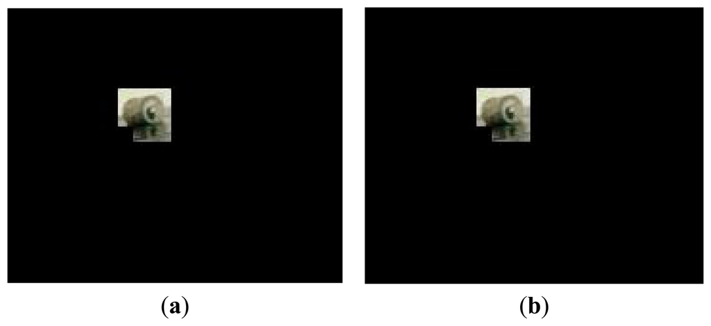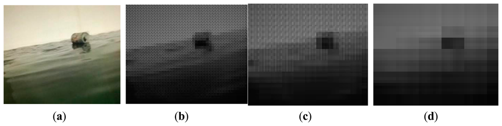 To reconstruct the new image, the 16 measurements corresponding to a block are transformed into a new block of size 4 × 4. Figure 6 gives the results of image construction under different block sizes. Take Figure 6b for example, where each block of size 8 × 8 is converted to another block of size 4 × 4. The new image is a quarter of the size of the original image. This allows us to work with lower dimension data, e.g., 176 × 144 pixels instead of 352 × 288. Moreover, the sizes of the new images, as shown in Figure 6c,d, fall from 352 × 288 to 88 × 72 and 44 × 36 respectively, but the reconstruction frames still preserve adequate object features. It can be expected that the block projection and image reconstruction result in computational efficiency with little loss of helpful information.