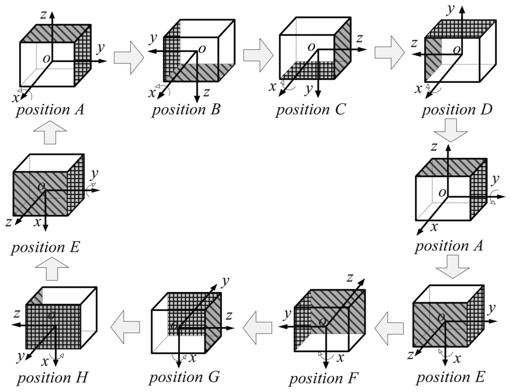 In this novel rotation scheme, the IMU rotates about two horizontal axes (x axis and y axis) and resides at eight different positions to satisfy the design principle introduced in the previous section.