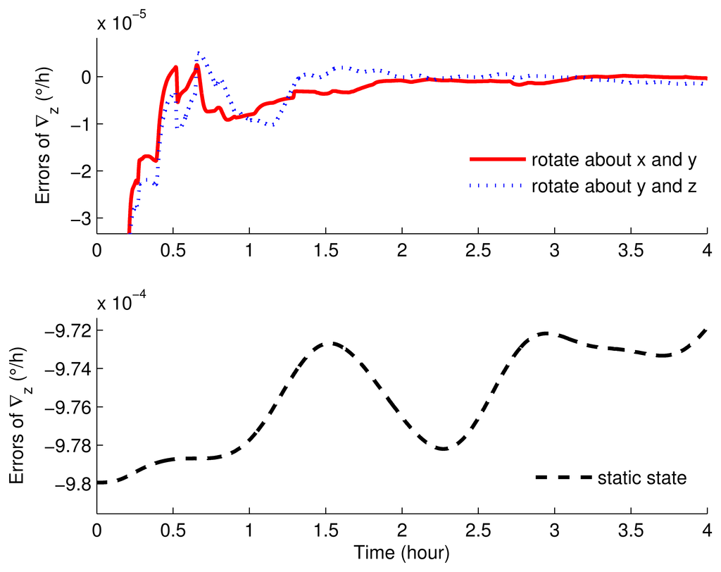 In modern marine navigation, the strapdown inertial navigation system (SINS) is widely used, due to its advantages of being more compact and autonomous [–]. However, the successive starting error of inertial sensors is one of the most major factors that will affect the system accuracy. Therefore, to maintain high navigation accuracy for a long time period, it is necessary to perform on-line calibration after the SINS starts [–]. The core of the SINS on-line calibration is that changing the motion states of the inertial measurement unit (IMU), including the angular motion and the linear motion, can significantly improve the system observability, and then, the optimal estimation of the inertial sensor errors can be obtained [–]. For high-speed carriers, such as aircraft, it is obviously easy to change the motion states. However, for sailing ships on the sea surface, during the mooring, the maneuver can be overlooked by approximation; even during sailing, the motor is still unobvious, as the acceleration, de-acceleration and turning of ships are all extremely slow. Therefore, for vessels, it is not easy to change the spatial position of the IMU. In order to deal with the above-mentioned problem, the dual-axial rotating SINS emerged. In the rotating SINS, according to specific rotary schemes, the IMU spatial position can be changed by utilizing a rotating mechanism that has two degrees of freedom, increasing the observability of the inertial sensor errors dramatically [,,].