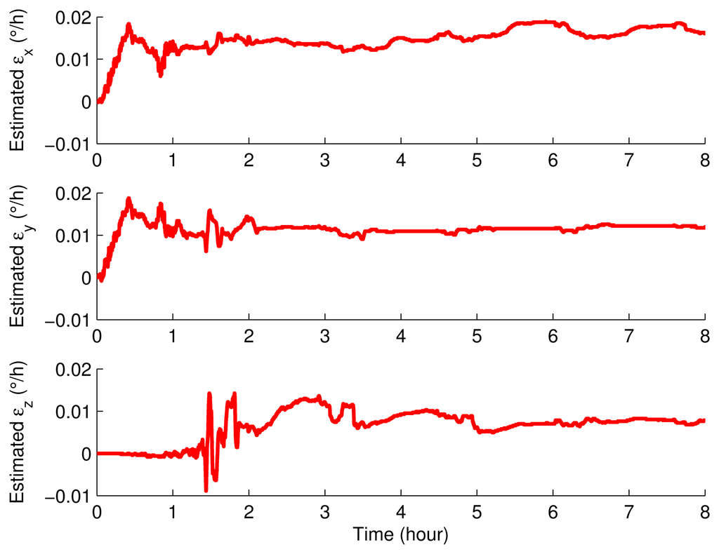The IMU remained static about 0.7 h and then rotated according to the rotary scheme proposed in Section 3. The inertial sensor errors and the misalignment angles were estimated by using the Kalman filter, and the results are shown in Figures 11, 12 and 13.
