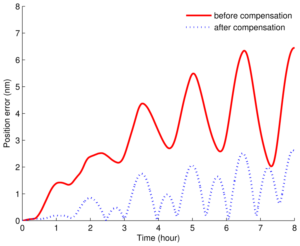 It can be seen obviously from Figures 11, 12 and 13 that the estimated curves were all stable in 4 h. Thus, in order to verify the estimated results, the estimated results at 4 h were compensated for and the position errors before and after the compensation were compared, as shown in Figure 14.