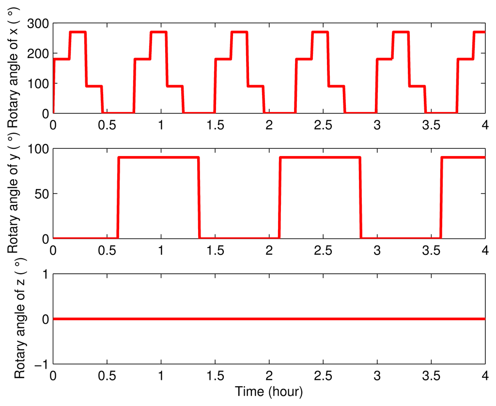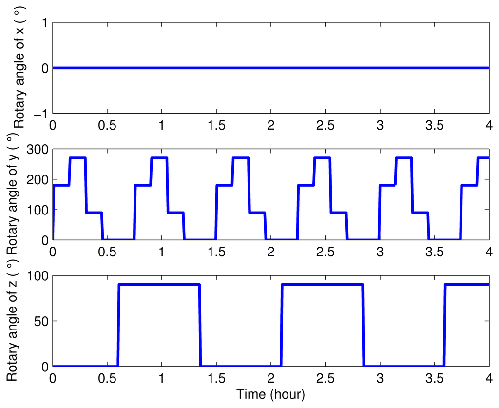 Next, simulations were carried out to verify the effectiveness and superiority of the eight-position rotating scheme proposed in this paper. In order to make a better illustration, three groups of simulations and their results were compared below. In one simulation, the SINS was set as stationary. Contrarily, the IMU was set as rotary in the other two simulations. The only difference between these two simulations is in their rotating axes: the first one was rotating about the x axis and y axis proposed in this paper, while the second one was rotating about the y axis and z axis proposed in []. The settings of the rotary angles in these two rotary simulations are described in Figures 3 and 4.