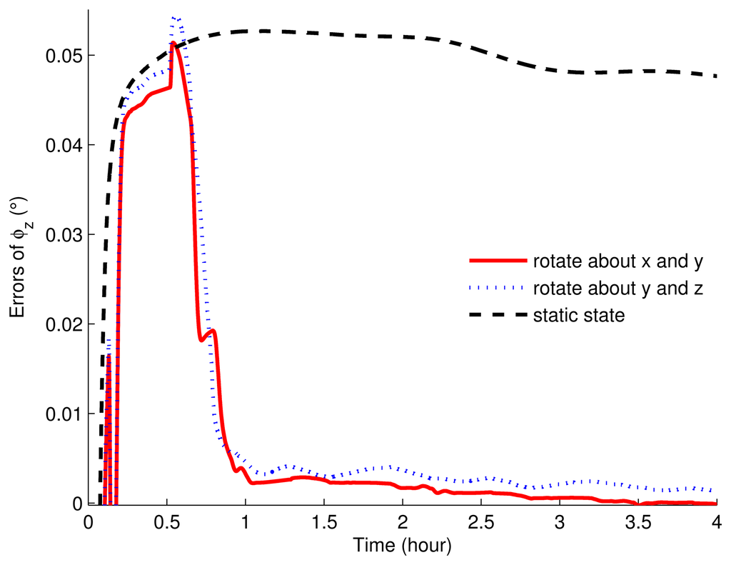 The correlation error curves of the misalignment angles of the three simulations are shown in Figures 5 and 6. When the IMU was set as stationary, the misalignment errors were relatively large. That is, in stationary mode, the misalignment angles cannot be estimated, while those in the rotating simulations can be estimated readily. As can be seen, in rotating simulations, the horizontal angle errors were almost similar, except that the curves had more waves when the IMU rotated about the y axis and z axis. Regarding the azimuth angle error, the simulation with the eight-position scheme rotating about the x axis and y axis can obtain a smaller estimated error.