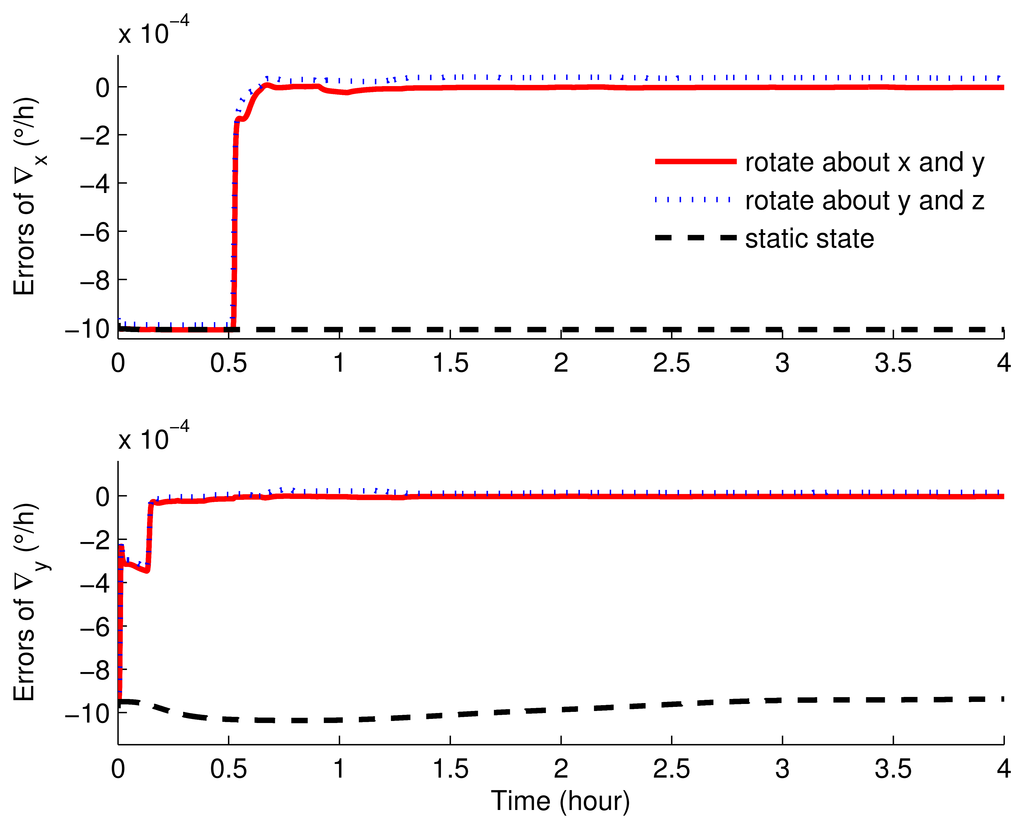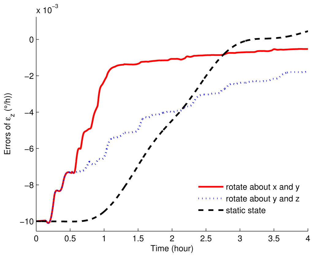 In Figures 7 and 8, the error curves of the gyroscope drifts were compared. As shown in these figures, in stationary mode, only εy can be estimated, but with poor accuracy. The error of εy still had about 0.002°/h left. Additionally, εz was not restrained in 4 h, while εx was not estimated at all. On the other hand, compared with the results of the rotary simulations, the performances with the eight-position scheme rotating around the x axis and y axis were much better. With this scheme, the horizontal gyroscope drifts were convergent and steady within 1 h, while the azimuth gyroscope drift was convergent in 1.5 h. What is more, the convergence rate and the accuracy were both superior to the other rotating simulation.