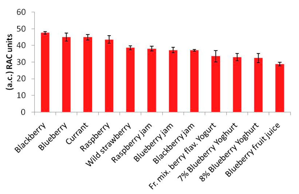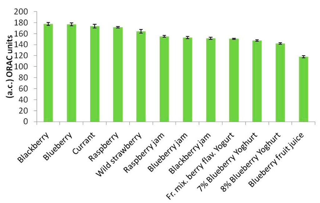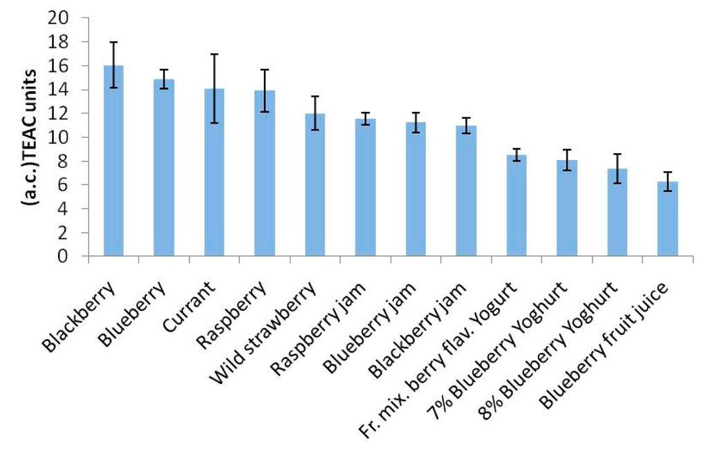 Fresh mixed berries confirmed the expected antioxidant properties, in agreement with the abundant literature data. Blackberries were found to have a slightly greater antioxidant capacity for equal sample weight; this higher ranking was found in the results of all three different methods.