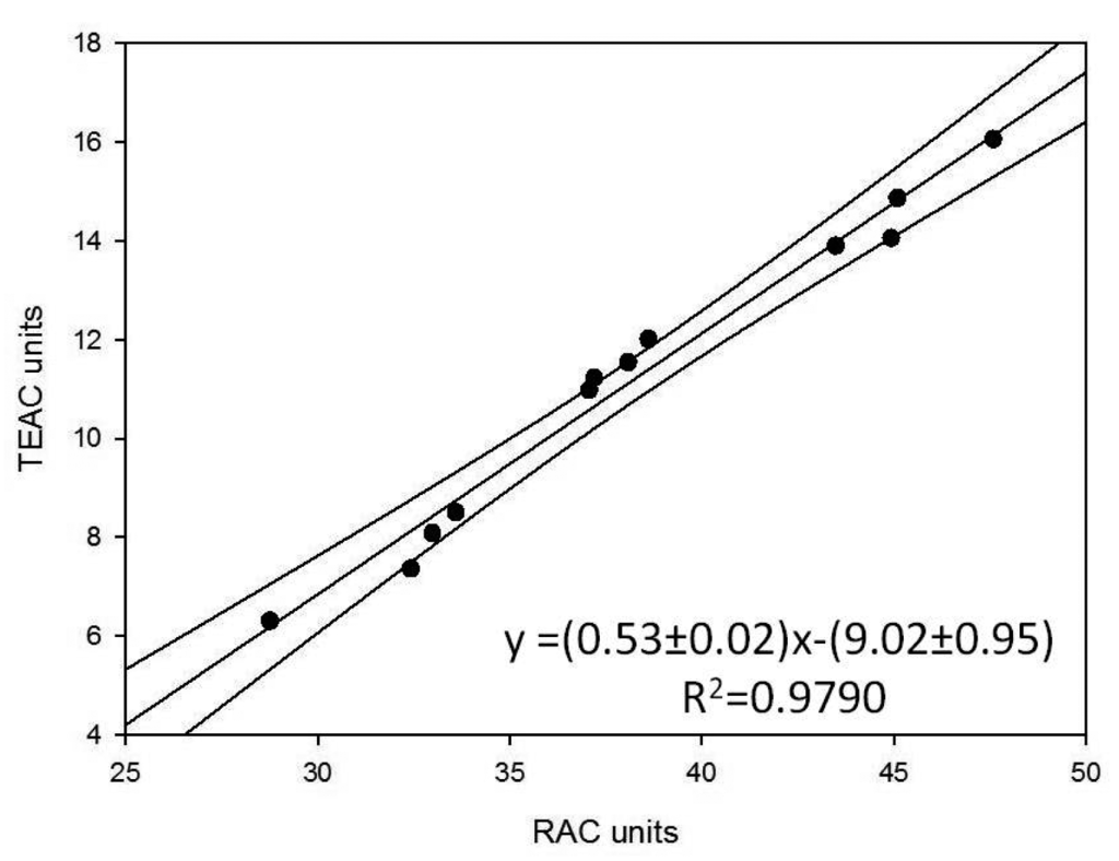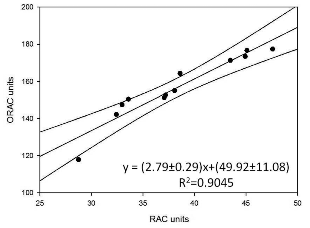 The antioxidant capacity was expressed in RAC (Relative Antioxidant Capacity) units, by means of the following expression: