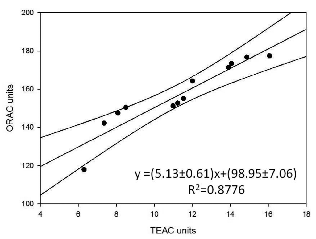 They also represent the mean of three successive applications of the same method. Comparison of the trends of the histograms in Figures 2, 3 and 4 shows how these trends are quite similar in all three cases. In order to analyse the correlation between the results using the three methods, the straight correlation lines referring to the ORAC and the SOD biosensor method, the spectrophotometric and the SOD biosensor method, and lastly the ORAC and the spectrophotometric method, respectively, are reported in Figures 5, 6 and 7.