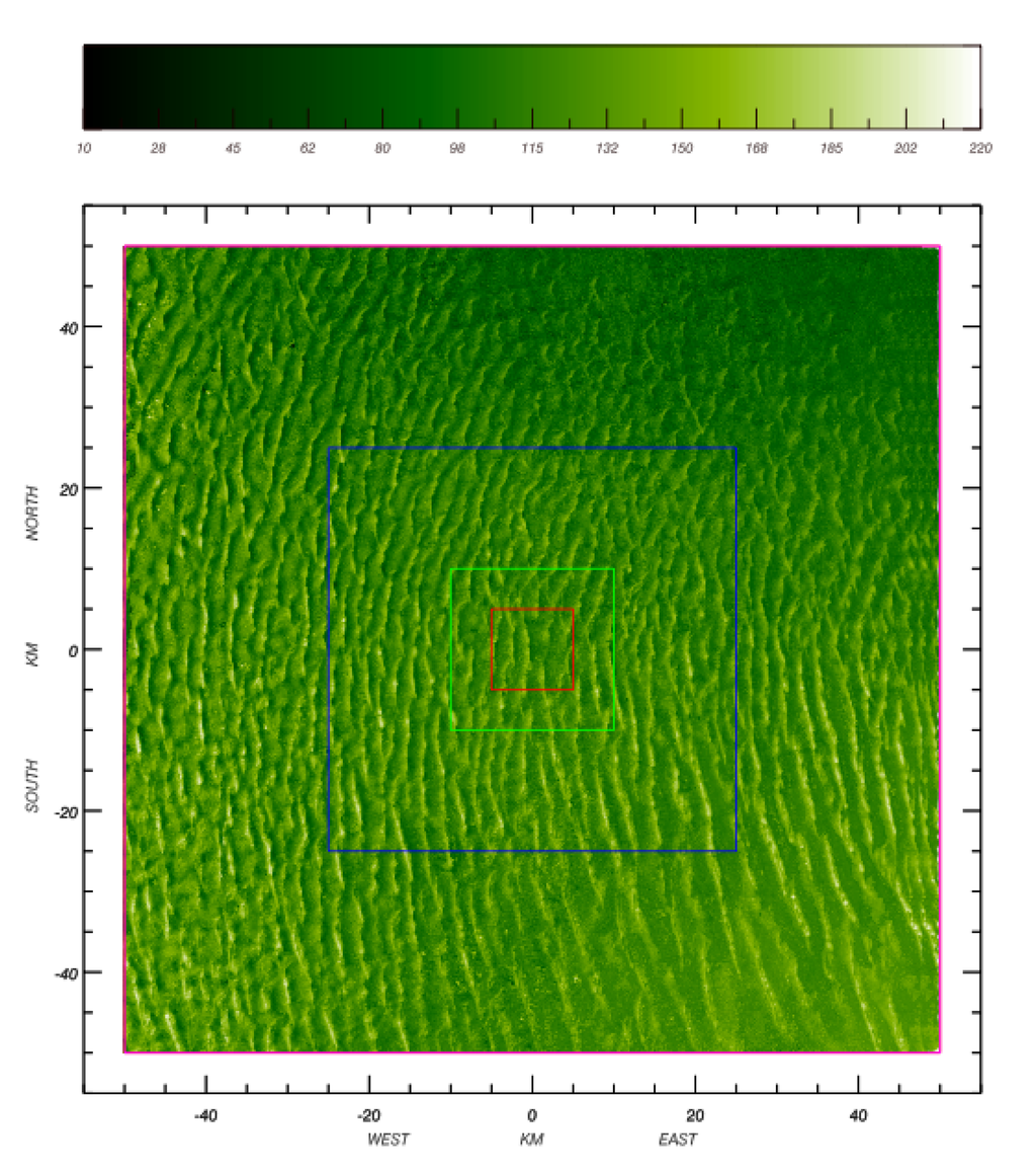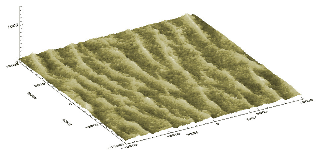 Figure 2 shows a 20 km-long longitudinal elevation profile centered at 28.55° N and 23.39° E. Sand dunes are typically 60 m high with an inter-dune distance ranging from 1000 m to 2000 m. The average altitude over that 100 km × 100 km area, shown in Figure 1, is about 120 m, with a standard deviation of 19 m.