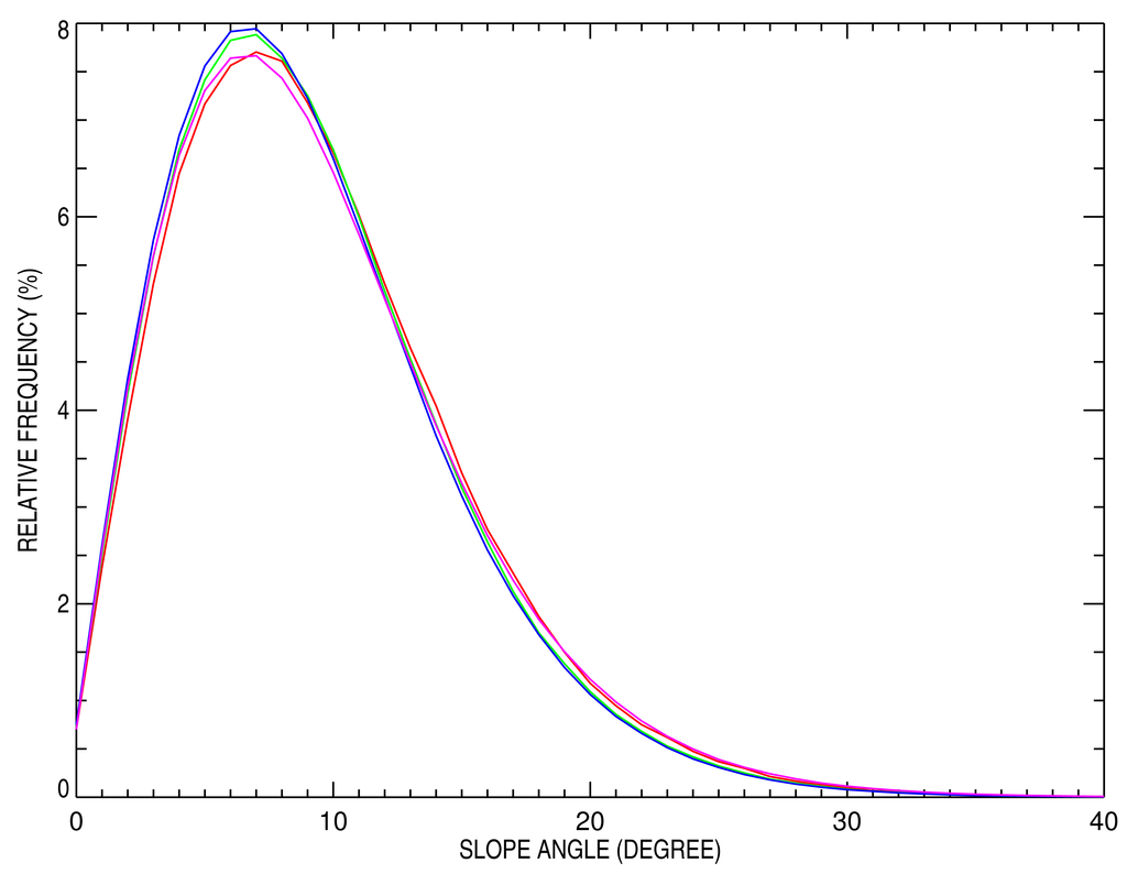 For each of these ROIs, the slope distribution has been analyzed based on the ATSER DEM. Results are shown in Figure 3. All ROIs exhibit a maximum slope frequency of around 6°–7°. The 20 km × 20 km and 50 km × 50 km ROIs have slightly less slopes with angles higher than 15° compared to the 10 km × 10 km and 100 ×100 km ones. Note that, whatever the ROI size, the maximum sand dune slope or repose angle does not exceed 35°, a number in agreement with expected values for dry sand [32].
