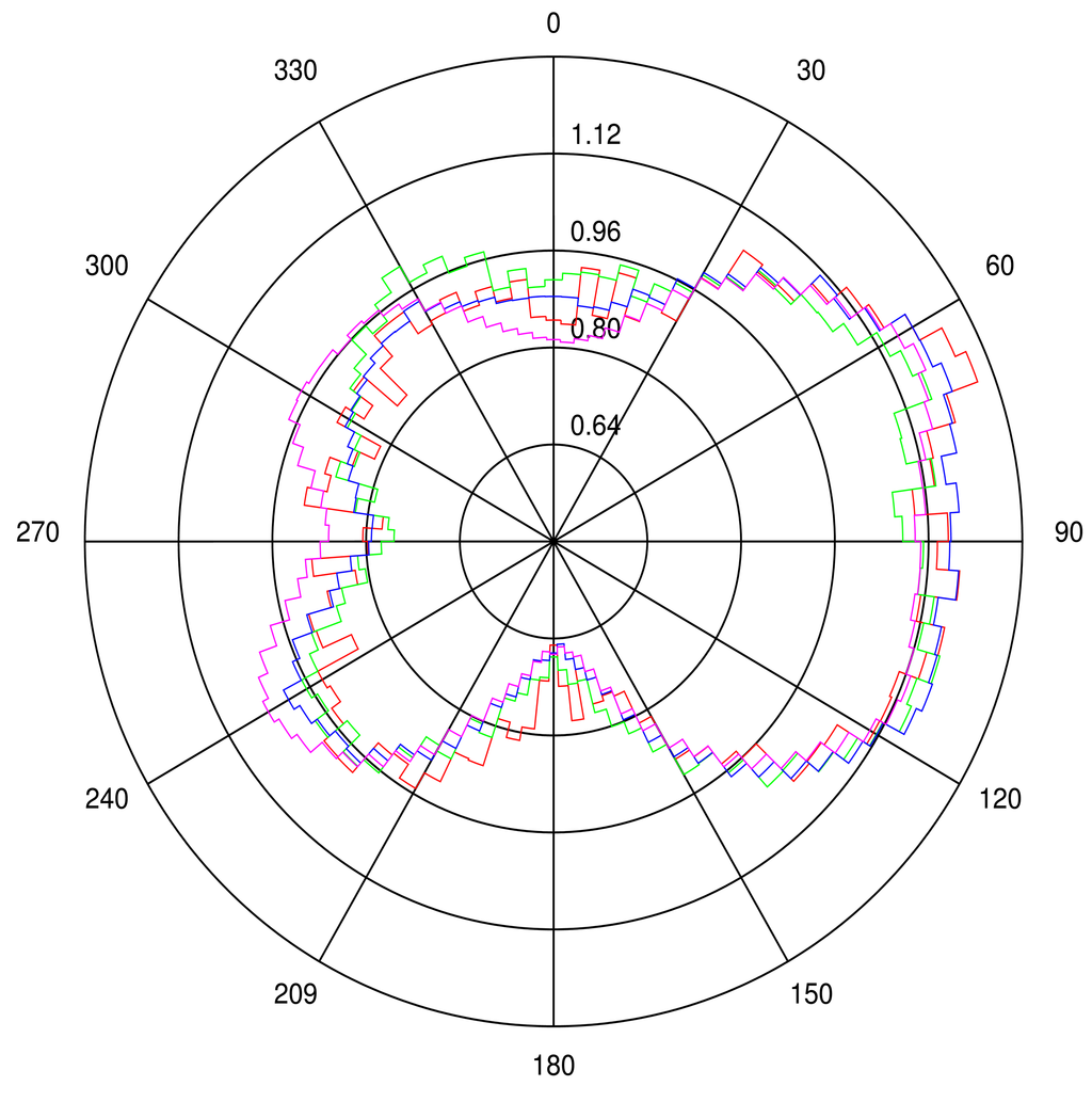 We next evaluate the azimuthal distribution of the slopes having a repose angles affecting surface BRF, i.e., lying between 15° and 35°; Figure 4. For all ROIs, steep slopes are predominantly pointing toward the east direction, i.e., downwind. The 100 km × 100 km ROI has the most regular slope azimuthal distribution and the smallest one, i.e., 10 km × 10 km, the most irregular one. These steep slopes, observed facing away from the wind direction, cast more shadow than those on the opposite side, resulting in different reflectance magnitude as a function of the illumination azimuth direction. It is therefore expected that this uneven slope azimuth distribution is responsible for BRF effects, depending on the azimuth illumination angle, which will be analyzed in Section 5.