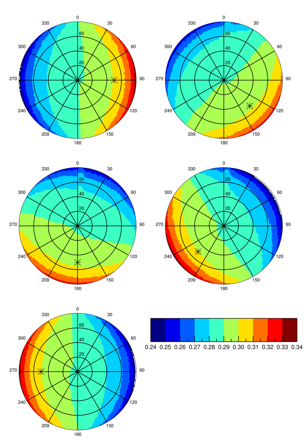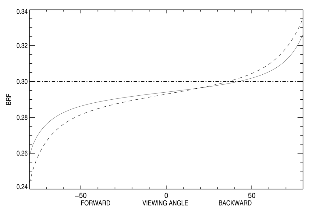 It has been shown that Sun azimuth angle has a more pronounced effect on surface BRF than the ROI size. Two illumination azimuth angles of, respectively, 135° and 225° have been analyzed in detail. They correspond to typical mid-morning and mid-afternoon Sun synchronous polar orbiting radiometer acquisition conditions. The principal plane surface BRF difference between these two illumination directions can exceed 1%, especially when the SZA is large. In the perpendicular plane, the difference does not exceed 0.5%.