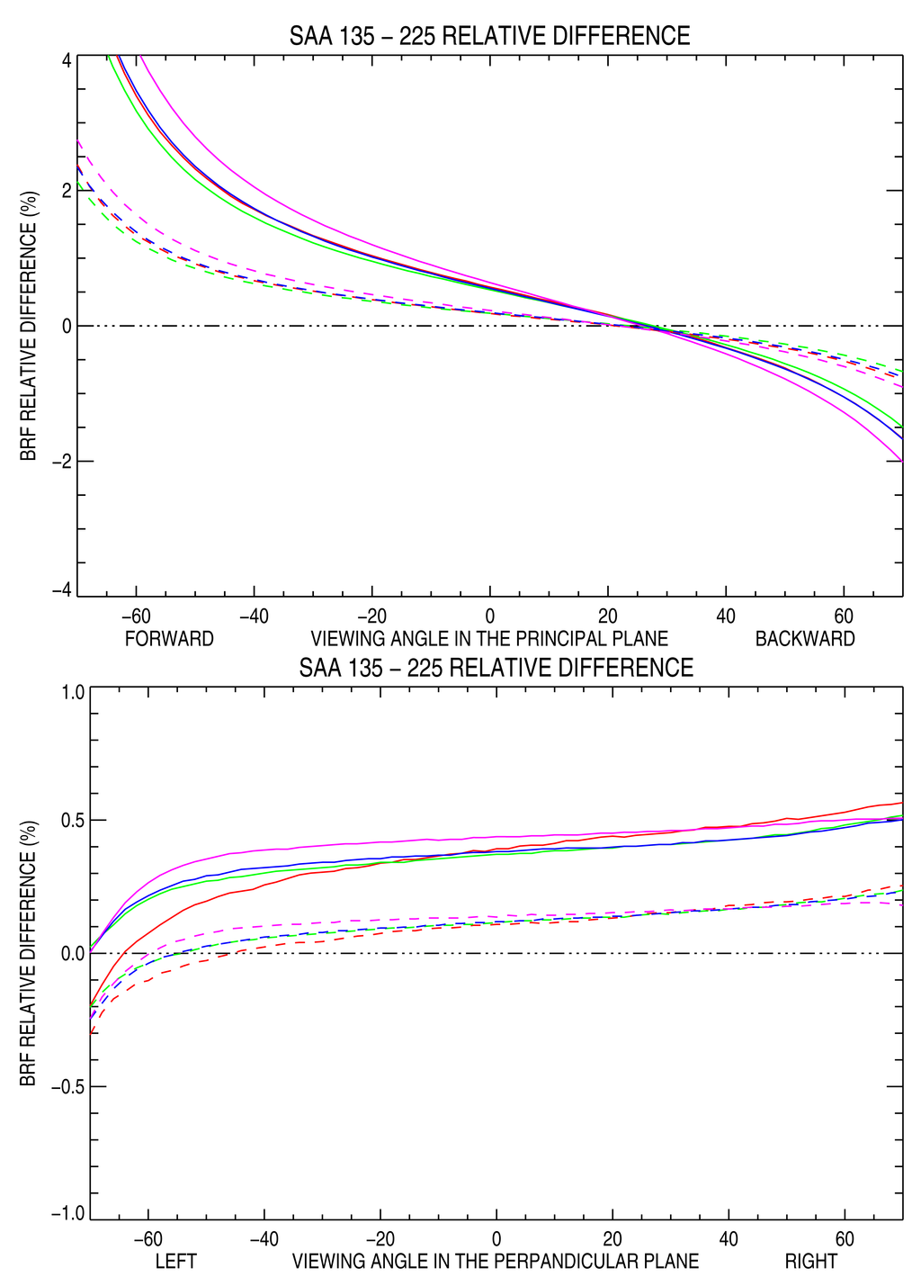 To further quantify the difference between these two observation conditions, the surface BRF relative difference between SAA equal to 135° and 225° has been estimated in the principal and perpendicular planes over the four different ROIs. Results are shown in Figure 9 for two different SZA values, i.e., 25° and 50°. In the principal plane, relative differences are more pronounced in the forward than in the backscattering direction. The relative differences are in the range -2%–+4% when SZA is equal to 50° and -1%–+2% when SZA equals 25°. These differences are twice as small when VZA is restricted to the [-40°, +40°] interval. The largest relative difference occurs on the 100 km × 100 km ROI, while the other three ROIs have a very similar behavior. These findings are in good agreement with the results of Table 2, showing that the ROI size has limited impact on the surface BRF mean value.