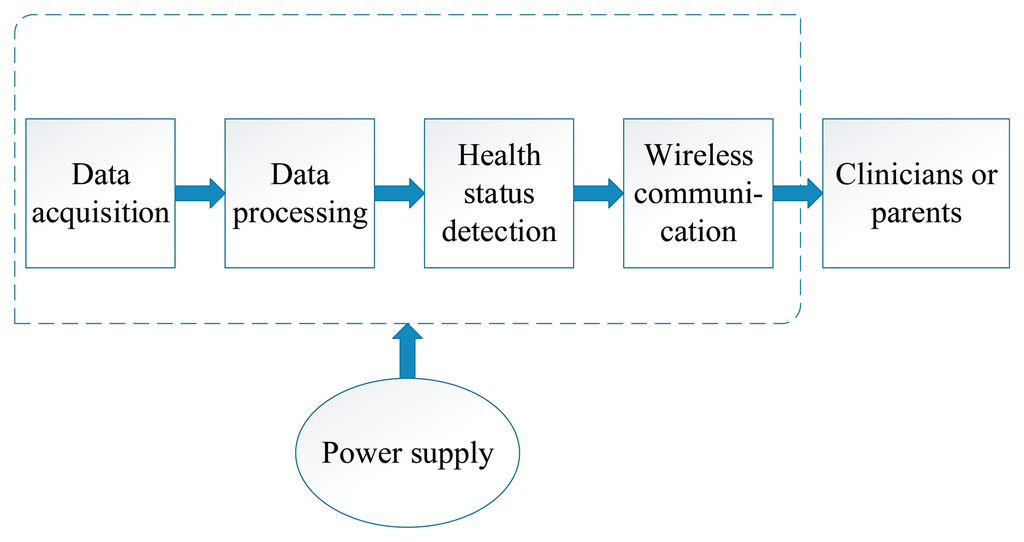 A wearable sensor system may encompass a wide variety of components: sensors, wearable materials, smart textiles, actuators, power supplies, wireless communication modules and links, control and processing units, an interface for the user, software, and advanced algorithms for data extraction and decision-making. Generally, wearable sensor systems for health monitoring need to achieve specific functions under strict medical criteria and significant hardware resource limitations. More specifically, a qualified wearable sensor system design needs to take several wearability criteria into account, for example, the outward appearance should meet aesthetic requirements, the weight and the size of the system need to be small, and it should not hinder the user's movements and actions, especially in the case of infants. In addition, radiation or other types of health hazards are not allowed [25].